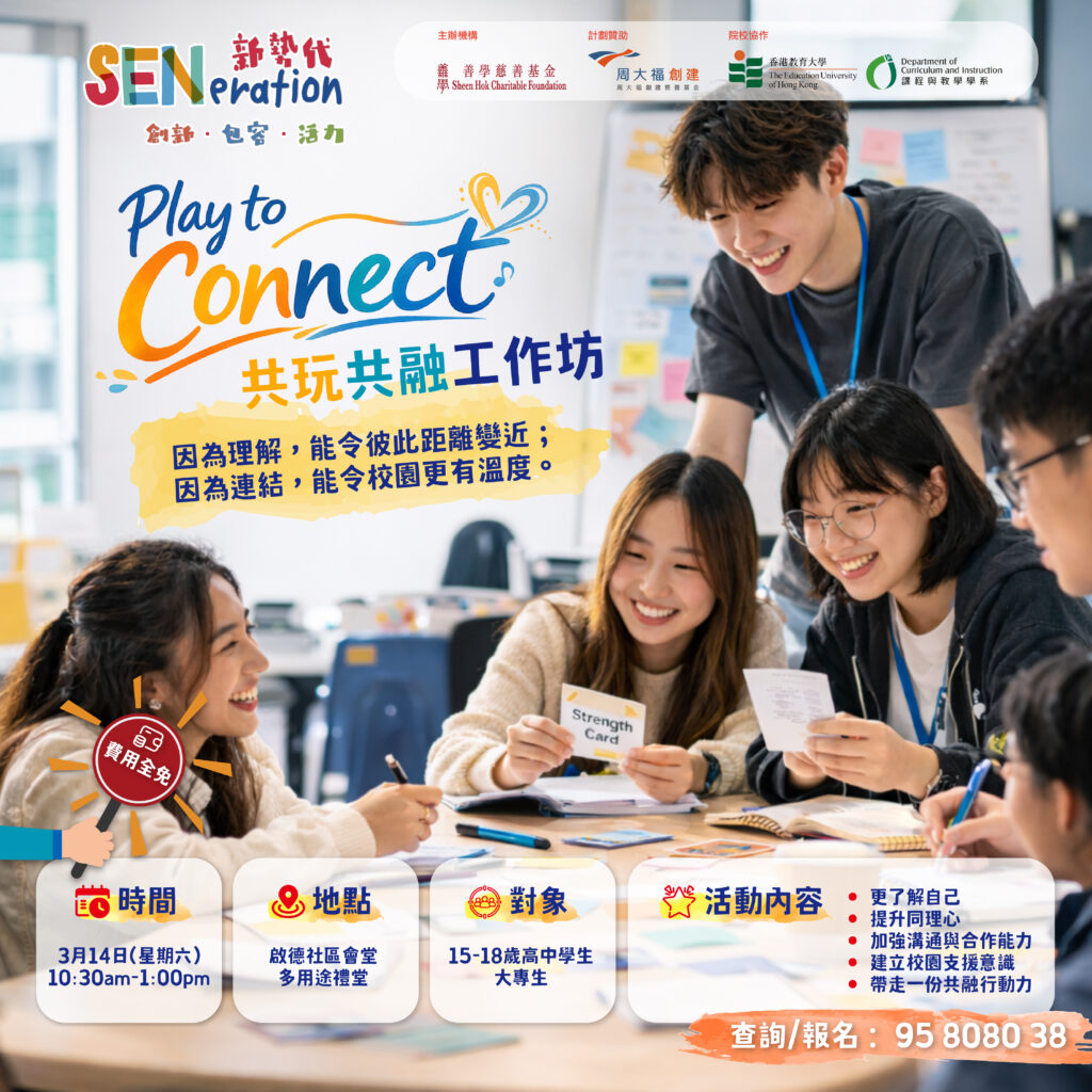 為推動更有溫度、更具支持性的校園樂融文化,SENeration 《Play to Connect 共玩共融工作坊》,透過遊戲、互動與交流,讓參加者在輕鬆而有意義的體驗中,學習理解差異、建立連結,並進一步提升同理心、溝通能力與合作意識。這個方向亦呼應 SENeration 一直以來「理解・關懷・行動・連結」為核心的培訓理念。